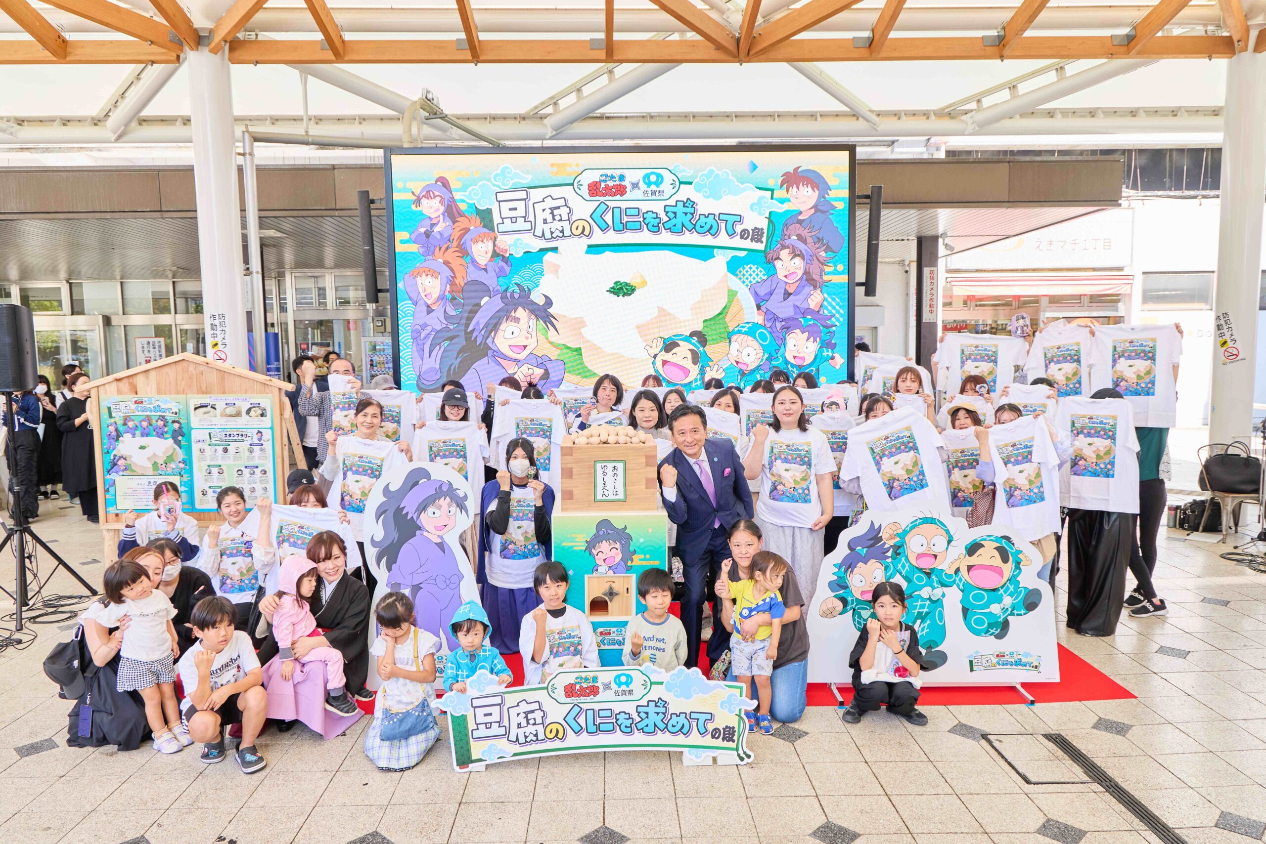 『忍たま乱太郎』のファンの方々をはじめ、多くの方にご来場いただいた今回の除幕式。先着50名様にプレゼントした「忍たま乱太郎×佐賀県~豆腐のくにを求めての段~」限定デザインのTシャツを着た来場者と共に「福きたる大豆くじ」を囲み、記念撮影を行いました。