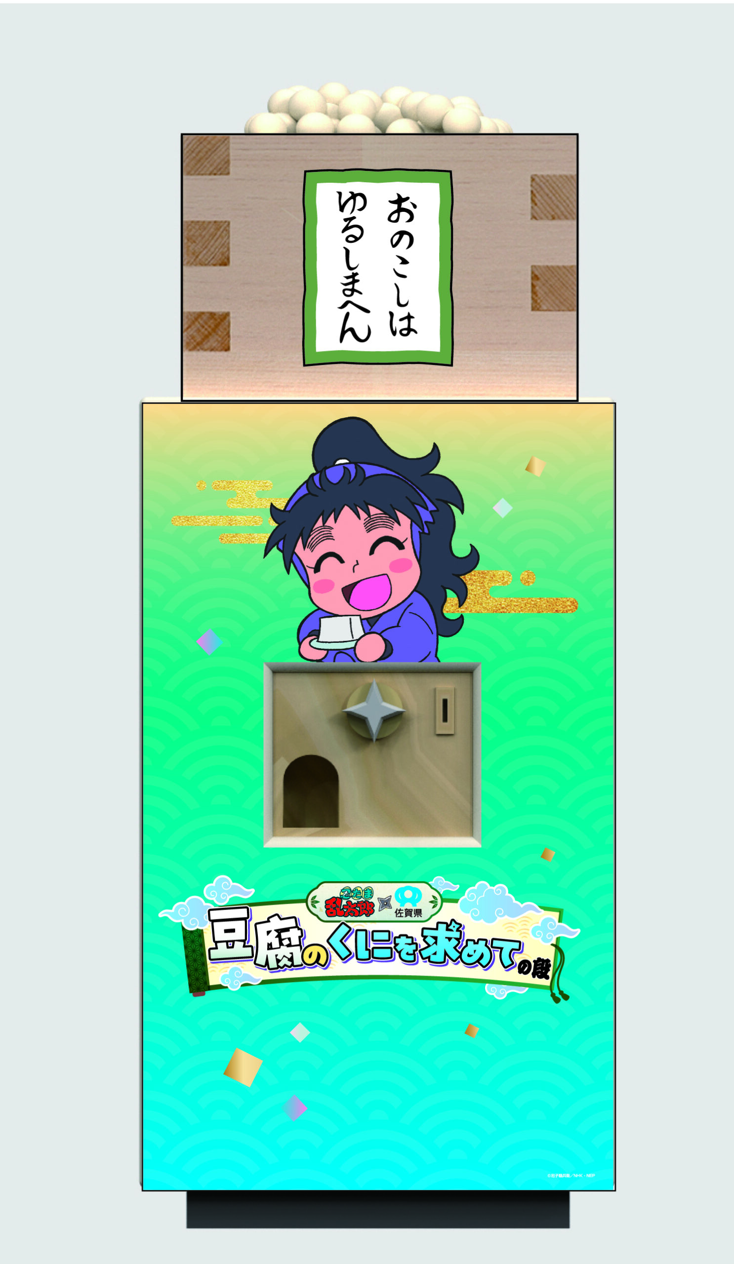 佐賀県は県内のモノ・コトを起点に、誰もがハッとしてドキドキする“新しい驚き”をつくる情報発信プロジェクト「サガプライズ!」の一環として、アニメ『忍たま乱太郎』とコラボする新プロジェクト「忍たま乱太郎×佐賀県~豆腐のくにを求めての段~」を“豆腐の日”でもある2025年10月2日(木曜日)から開始。佐賀県内の豆腐店等を巡るスタンプラリーなどを開催中です。今回、佐賀県と『忍たま乱太郎』のコラボの象徴として、佐賀駅前交流広場に桝に入った大豆を再現したモニュメント「福きたる大豆くじ」を設置。初お披露目の場として、2025年10月20日(月曜日)に除幕式を開催しました。